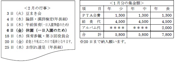 ◎12月同様に園内用ジャンパー、手袋、うがい用お茶(水筒)の準備をお願いします。